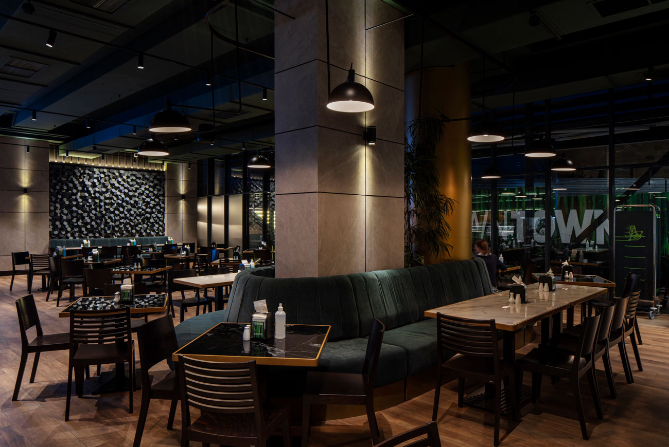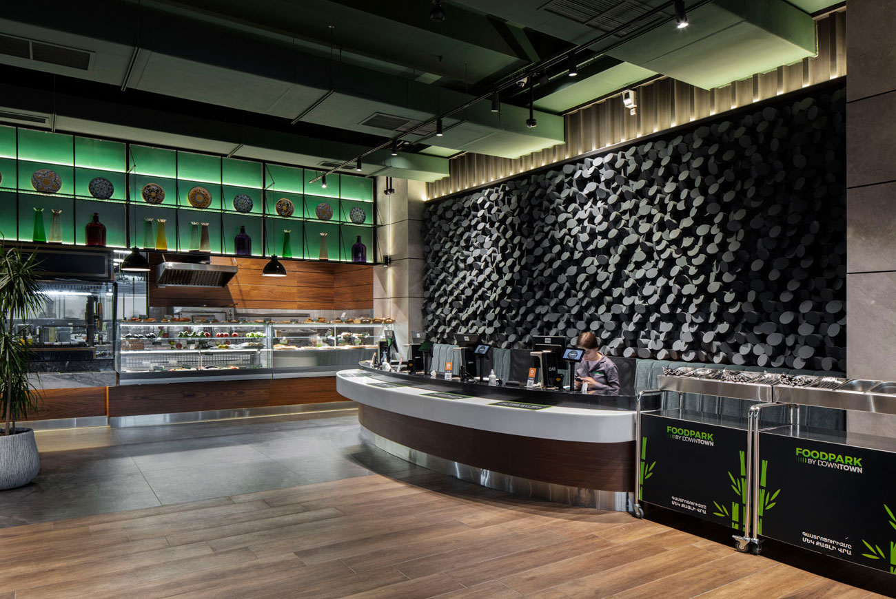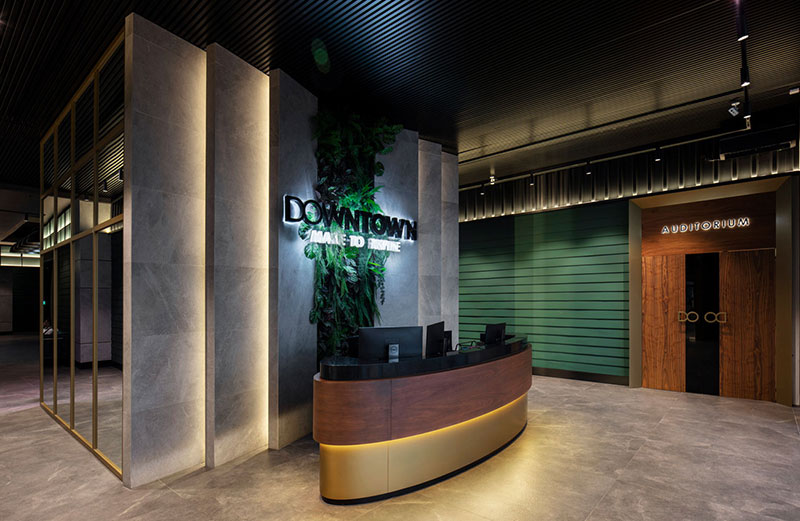 Downtown-ը սկսվում է «սրճարանով», որտեղ զամբյուղով բույսերը ծառայում են որպես գոտիավորման տարրեր: Բոլոր նստատեղերը թավշյա կանաչ են, իսկ սեղանի սալերը՝ բնական քարից։ Սանհանգույցը ձևավորված է նույն տարրերով, ինչ գլխավոր սրահը՝ փայտե կանաչ պատ, մեծ լամպեր, բնական քարից լվացարաններ։