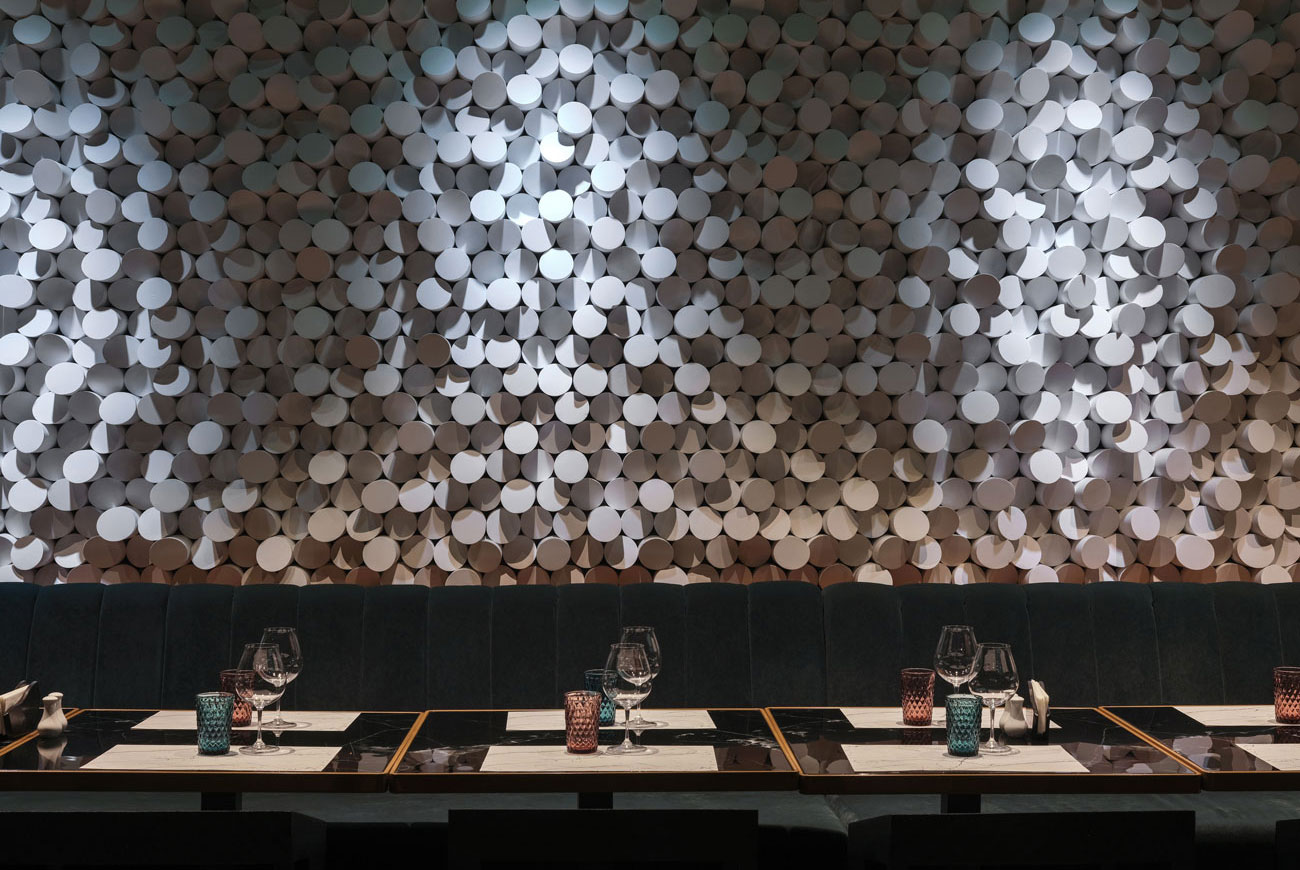 Դիտավորյալ ենք ընտրել շրջանի փափուկ ֆորման ու ձևավորել պատը տարբեր խորությունների ու երկարությունների գլաններով, որոնք թեպետ կտրված են նույն անկյան տակ, բայց և տեղադրված են տարբեր ուղղություններով: