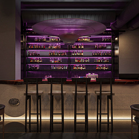 Фоновое освещение является ключевым элементом лаунж-бара: белый и пурпурный.